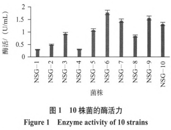 將挑選獲得的10株菌開展搖瓶發(fā)醇,用DNS測定方法粗酶液酶魅力。結(jié)果如圖所示1所顯示,NSG-6在經(jīng)耐堿性試驗后酶魅力為1.78U/mL相對性最大,其一切正常酶魅力為2.05U/mL,故將其做為供試菌種。