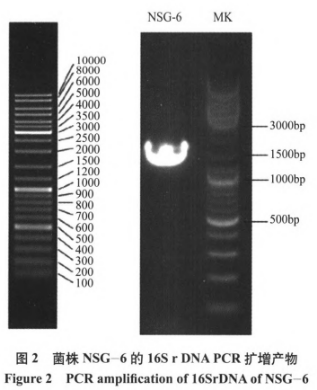 PCR物質(zhì)瓊脂糖凝膠電泳結(jié)果即Marker構(gòu)成見圖2。Marker中3000bp、1000bp和500bp雜帶濃度值為60ng/3μL表明為增亮帶,其他雜帶濃度值均為30ng/3μL,電泳原理方位從上到下。從電泳原理結(jié)果得知:PCR擴增物質(zhì)雜帶清楚、沒有托尾狀況,且相對分子質(zhì)量在1400bp上下與16SrDNA片段相符合,可開展事后試驗。