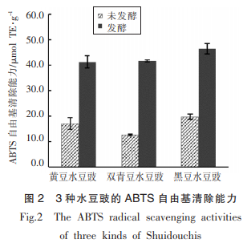 解木薯淀粉枯草芽孢菌CAUnDJ118發(fā)醇水豆豉的DPPH氧自由基消除工作能力由高到低為:大黑豆水豆豉(15.5μmolTE/g)、大豆水豆豉(9.5μmolTE/g)、雙青豌豆水豆豉(6.8μmolTE/g)(圖1)。與未發(fā)醇時對比,解木薯淀粉枯草芽孢菌CAUnDJ118發(fā)醇大豆、雙青豌豆、大黑豆水豆豉DPPH氧自由基消除工作能力各自提升了2.5,3.3,3.9倍。