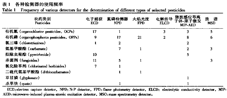 近些年,柱效高。分離出來功能強(qiáng)、敏感度高的毛細(xì)血管氣象色譜儀擁有較大發(fā)展趨勢(shì)。尤其是毛細(xì)管柱 和氣相系統(tǒng)軟件的逐步完善,使毛細(xì)血管氣象色譜儀的使用更為普遍。雖然試品前解決的凈化處理作用越 來越高.但試品中的影響物為難以避免的.因此當(dāng)代氣象色譜儀–般選用可選擇性探測(cè)器,理想化的 探測(cè)器自然是只對(duì)“總體目標(biāo)"化肥回應(yīng),而對(duì)其他化學(xué)物質(zhì)無響應(yīng)?;驶旧隙紟в须s分子.并且常常 是一個(gè)分子結(jié)構(gòu)含好幾個(gè)雜分子,普遍的雜分子有O,P,S,N,Cl,Br和F。因而,不一樣種類的化肥應(yīng)采 用不一樣的探測(cè)器。Tores( 曾對(duì)近年來近60篇參考文獻(xiàn)中各種各樣探測(cè)器的應(yīng)用頻率開展了統(tǒng)計(jì)分析(見表1)。從表1能夠看得出,電解法傳輸探測(cè)器(ELCD)、微波加熱磁感應(yīng)等離子技術(shù)-分子激起探測(cè)器(MIP- AED) .質(zhì)譜分析(MSD)等探測(cè)器中。電子器件捕捉探測(cè)器( ECD).氰磷探測(cè)器(NPD).火苗亮度探測(cè)器( FPD)依然是較常用的探測(cè)器。