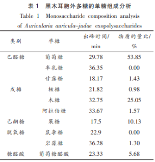 木耳胞外含糖量歷經(jīng)酸水解反應(yīng)和衍化化時(shí),運(yùn)用HPLC剖析其單糖構(gòu)成。數(shù)據(jù)顯示,葡萄糖水和麥芽糖醇為其具體的單糖成分(摩爾質(zhì)量之比53.85%和25.05%),也有少許的甘露糖、葡萄糖、巖藻糖、阿拉伯糖和葡萄糖醛酸(表1)。與紅外線定量分析結(jié)果一致,木耳胞外含糖量是由多種多樣單糖成分組成的雜合含糖量。