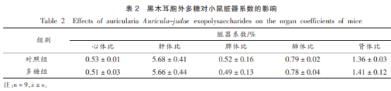 與實(shí)驗(yàn)組對(duì)比,灌胃木耳胞外含糖量后小白鼠休重?zé)o顯著轉(zhuǎn)變 (圖2)。內(nèi)臟器官指數(shù)是體現(xiàn)動(dòng)物器官生長發(fā)育的主要指標(biāo)值,可直接體現(xiàn)受試物對(duì)小動(dòng)物存有的危害功效。本分析根據(jù)稱重小白鼠各內(nèi)臟器官機(jī)構(gòu)品質(zhì),測(cè)算其內(nèi)臟器官指數(shù)。木耳胞外含糖量對(duì)小白鼠內(nèi)臟器官指數(shù)的危害見表2,數(shù)據(jù)分析表明,試品組和對(duì)比結(jié)果無顯著性差異(P>0.05)。以上實(shí)驗(yàn)說明,灌胃木耳胞外含糖量不容易造成小白鼠內(nèi)臟器官產(chǎn)生生理性出現(xiàn)異常。