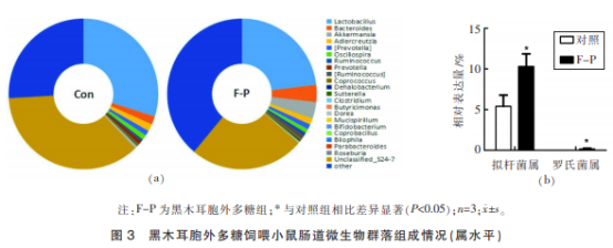 本實(shí)驗(yàn)運(yùn)用微生物菌種16SrRNA高通量測(cè)序技術(shù)性,探尋了灌胃木耳胞外含糖量小白鼠腸菌的變動(dòng)狀況。轉(zhuǎn)錄組測(cè)序所得的原始記錄經(jīng)挑選過慮后,對(duì)得到的隊(duì)列開展可實(shí)際操作模塊剖析(OTU)合并區(qū)劃,選用Greengenes數(shù)據(jù)庫開展注解,根據(jù)多種多樣多自變量應(yīng)用統(tǒng)計(jì)學(xué)分析工具對(duì)不一樣樣版(組)微生物菌種群落結(jié)構(gòu)差別開展剖析,獲得了小白鼠腸道微生物16SrRNA在屬水準(zhǔn)OTU編碼序列的相對(duì)豐度(圖3)。根據(jù)Metastats對(duì)樣版小組之間編碼序列量差別的較為檢測(cè)發(fā)覺,與實(shí)驗(yàn)組對(duì)比,擬桿菌屬和羅氏菌屬明顯提升(P<0.05),擬桿菌屬在含糖量組腸道微生物群中占(10.31±1.5)%,而對(duì)照實(shí)驗(yàn)為(5.4±1.38)%;羅氏菌屬在含糖量組里占(0.17±0.07)%,而在對(duì)照實(shí)驗(yàn)中未監(jiān)測(cè)到。