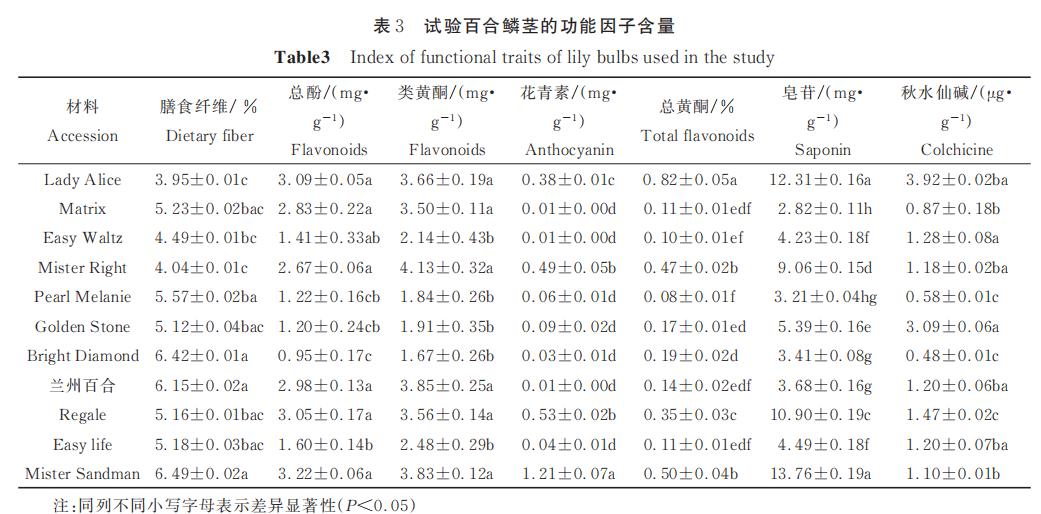 表3列舉了11種百合花根莖的作用成份成分,總酚的相應(yīng)成分在0.95~3.22mg·g-1中間,在其中EasyWaltz、Matrix、MisterRight、MisterSandman、LadyAlice和Regale的總酚相對性成分與蘭州百合無明顯差別,其他4種原材料的總酚相對性成分明顯小于蘭州百合。