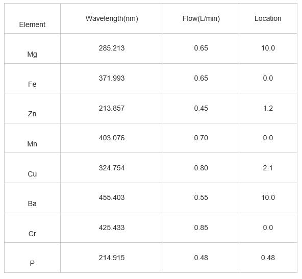 選用MP-OES法,被測(cè)原素被激起時(shí)可發(fā)送好幾條譜線,根據(jù)手機(jī)軟件挑選特點(diǎn)譜線抗壓強(qiáng)度大,環(huán)境小、受影響小的光波長(zhǎng),且信背比最高的發(fā)送譜線做為被測(cè)原素激起光波長(zhǎng)。將K、Ca、Na、Mg、Fe、Zn、Mn、Cu、Ba、Cr、P單標(biāo)貯備液(1 mg/mL),稀釋液配置成K、Ca、Na、Mg、Fe、Zn、Mn、Cu、Ba、Cr濃度值均為1 mg/L、P濃度值為40 mg/L的混和標(biāo)液,隨后各自開展光波長(zhǎng)掃描儀,挑選最好剖析譜線。提升后的被測(cè)原素光波長(zhǎng)見表1。