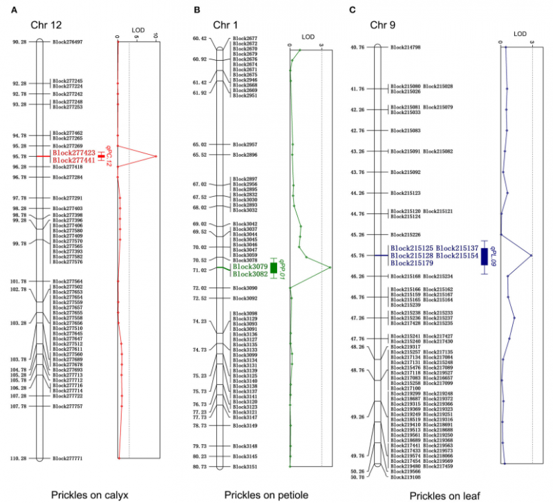 本分析對(duì)父母和一百個(gè)F2后代開展了重轉(zhuǎn)錄組測(cè)序,各自在父母中得到了2,989,312和1,369,910個(gè)高品質(zhì)SNP標(biāo)識(shí)。運(yùn)用這種SNP標(biāo)識(shí)在四季豆的12個(gè)性染色體中搭建了帶有278,89一個(gè)Bin標(biāo)識(shí)的密度高的遺傳圖譜。運(yùn)用這一遺傳圖譜學(xué)者對(duì)四季豆莖、葉子、葉莖和花萼刺開展了QTL精準(zhǔn)定位,在其中莖刺在第三、4、5、6和8性染色體上精確定位到五個(gè)有關(guān)QTLs,葉子、葉莖和花萼刺各自在第9、1和12性染色體上各精準(zhǔn)定位到一個(gè)QTL。