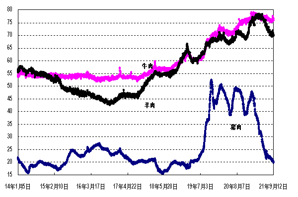 1. 豬肉的價格小幅度下挫,生雞蛋小幅度增漲。豬肉批發(fā)銷售市場周平均價1公斤20.3一元,同比跌2.7%,為持續(xù)5周小幅度下挫,同期相比低57.9%;牛羊肉1公斤76.55元,同比漲0.3%,同期相比高2.8%;牛肉1公斤70.50元,同比跌0.4%,同期相比低0.6%;白條雞1公斤16.8零元,同比跌0.2%,同期相比高1.0%。雞蛋批發(fā)銷售市場周平均價1公斤10.59元,同比漲2.5%,同期相比高29.3%。