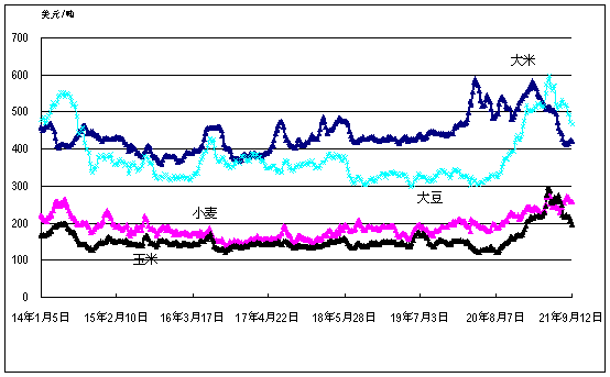 英國芝加哥商品交易所苞米、大豆油、黃豆和麥子近期期權(quán)合約收市周平均價一噸各自為197美元、126一美元、467美元和256美元,同比各自跌5%、4%、2%和1%,同期相比各自高44%、72%、32%和27%;國際性糖料聯(lián)合會原糖周平均價每磅19.74便士(一噸435美元),同比跌2%,同期相比高54%;泰國的100%B級和5%堆密度稻米泰國曼谷離岸賬戶周平均價一噸各自為421美元和406美元,同比均跌1%,同期相比均低22%。