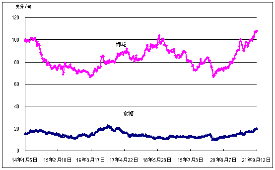 新加坡食用油荷蘭鹿特丹港到岸周平均價一噸124一美元,同比漲2%,同期相比高77%;國際性棉絮指數(shù)值(SM級)每磅107.97便士(一噸2358美元),同比漲1%,同期相比高44%。