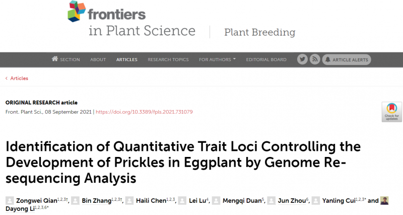近日,蔬菜水果研究室在國際性生物學(xué)刊物Frontiers in Plant Science(IF=5.75)上刊登了名為“Identification of Quantitative Trait Loci Controlling the Development of Prickles in Eggplant forbid Genome Re-sequencing Analysis”的研究分析畢業(yè)論文。該探討對四季豆葉柄、葉子、葉莖和花萼上的刺開展了QTL精準(zhǔn)定位,對培養(yǎng)主莖沒刺的四季豆種類給予了理論基礎(chǔ)。