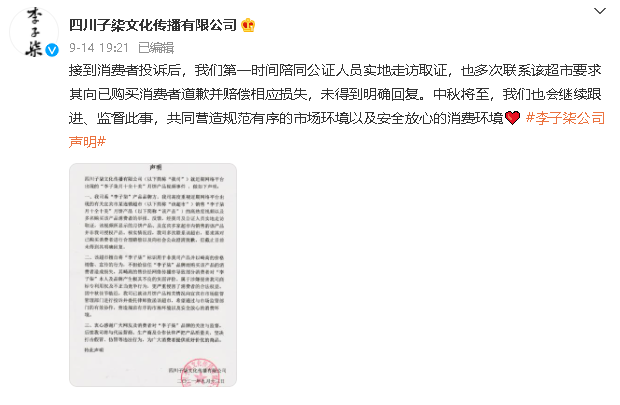 申明還稱,該商場私自將“李子柒”標(biāo)志用以非四川子柒文化傳媒有限責(zé)任公司商品并且以畸高的價錢市場銷售、宣傳策劃的個人行為,不僅給信賴“李子柒”知名品牌而選購該商品的顧客產(chǎn)生損害,其畸高的市場價經(jīng)媒體傳播亦造成 一部分顧客對“李子柒”自己及知名品牌造成極為不好的消極點評。歸屬于因涉嫌損害四川子柒文化傳媒有限責(zé)任公司商標(biāo)logo專利權(quán)用權(quán)及知識產(chǎn)權(quán)侵權(quán)個人行為,更比較嚴重侵犯了顧客的合法權(quán)利。因中秋節(jié)鄰近,四川子柒文化傳媒有限責(zé)任公司已就該中秋月餅商品有關(guān)狀況向樂山市銷售市場監(jiān)管機構(gòu)開展舉報并授權(quán)委托刑事辯護律師去函該商場,期待借助與銷售市場監(jiān)督機構(gòu)的高效合作,構(gòu)建標(biāo)準(zhǔn)合理的市場環(huán)境及其安全性安心的消費市場。