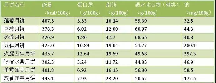 ▲ 幾種普遍月餅的營(yíng)養(yǎng)元素平均值