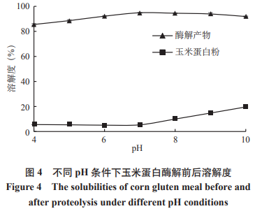 不一樣pH標準下玉米蛋白粉和酶解物質(zhì)的溶解性見圖4。
