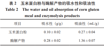 蛋白質(zhì)經(jīng)酶解之后會顯現(xiàn)出離子化的羥基和羧基,而這二種官能團全是親水基,與此同時,在溶解全過程中也會顯現(xiàn)出一些非極性的憎水性官能團,因而,與玉米蛋白粉對比,酶解物質(zhì)具備更強的吸水能力和吸油溶性,各自為0.28g/g和1.36mL/g,玉米蛋白粉僅為0.10g/g和0.27mL/g。玉米肽粉吸水能力和吸油溶性均較高,因而很適宜運用于食品工業(yè)中,可提高商品的持水溶性,改進其乳狀液特點,具備不錯的平穩(wěn)分散化的功效,與其它食品類成分混配性不錯。