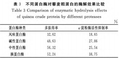 由表3得知,4種酶酶解后的活性多肽提取率都超出了30%,對α-胃蛋白酶活力具備一定的抑制效果,表明4種酶對黎麥蛋白質(zhì)都有著非常明顯的酶解實際效果,在其中中性蛋白酶和蛋白酶的活性多肽得率超出50%,而堿性蛋白酶和蛋白酶酶解后的抑制率較口味胰蛋白酶和中性蛋白酶高,蛋白酶解水平越大,活性多肽提取率也越高,轉(zhuǎn)化成的低分子結(jié)構(gòu)肽段就越大,具備抑止活力的肽段非常容易被溶解造成 抑止活力減少。充分考慮二種要素,挑選蛋白酶開展下一步的酶解實驗。