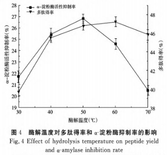 由圖4得知,活性多肽得率展現(xiàn)不斷上升發(fā)展趨勢,因為溫度的上升擴(kuò)大了酶與蛋白質(zhì)分子結(jié)構(gòu)的觸碰機(jī)遇,酶的活性也隨著提高,活性多肽得率慢慢上升,α-胃蛋白酶活力抑制率也隨著上升,在50℃做到最高值26.8%,接著發(fā)生減少,溫度超出60℃很有可能會立即使小分子活性肽進(jìn)一步離解,缺失抑止活力,進(jìn)而使α-胃蛋白酶活力抑制率降低。因而,挑選酶解溫度在50℃上下。