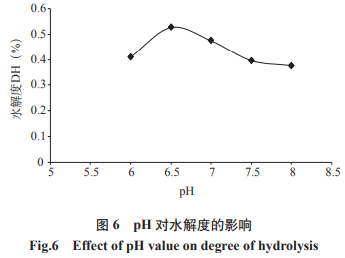 由圖6、圖7得知,伴隨著pH的上升,紅花籽粕的水解度和復(fù)原力發(fā)生先上升,后降低的發(fā)展趨勢(shì),而且在pH為6.5時(shí),其水解度和復(fù)原力較大。這很有可能與紅花籽粕中包含的蛋白質(zhì)的特性相關(guān)。因而,挑選6.5為適合pH。