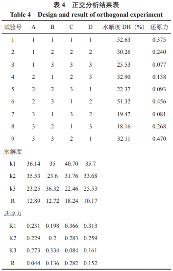 由表4正交實(shí)驗(yàn)的結(jié)果顯示,根據(jù)偏差分析表明危害水解度的要素為:pH>超聲波時(shí)間>超聲波溫度>酶使用量,危害復(fù)原力的要素為:pH>酶使用量>超聲波溫度>超聲波時(shí)間,綜合分析看來,最好的技術(shù)標(biāo)準(zhǔn)為超聲波時(shí)間10min,超聲波溫度65℃,pH6.5,酶使用量1.9%。