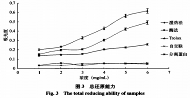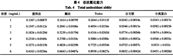 各自用PBS緩沖溶液配備濃度值為:lmg/mL、2mg/mL、3mg/mL、4mg/mL、5mg/mL、6mg/mL的大黑豆分離蛋白水溶液、自化學(xué)交聯(lián)大黑豆蛋白質(zhì)水溶液、寒濕法糖基化大黑豆蛋白質(zhì)水溶液、酶法糖基化大黑豆蛋水溶液及其對(duì)比物Trolox水溶液;以O(shè)D值為評(píng)價(jià)方法,對(duì)五種試品溶總復(fù)原工作能力開展較為,結(jié)果見表4。