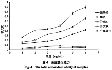由圖4由此可見:濃度值為lmg/mL~6mg/mL濃度值為lmg/mL~6mg/mL,酶法糖基化大黑豆蛋白質(zhì)、寒濕法糖基化大黑豆蛋白質(zhì)及其Trolox似總抗氧化能力均高過自化學(xué)交聯(lián)大黑豆蛋白質(zhì)及其大黑豆分離蛋白;自化學(xué)交聯(lián)大黑豆蛋白質(zhì)及其大黑豆分離蛋白隨濃度值的提高總抗氧化無顯著性差異轉(zhuǎn)變,濃度值為lmg/mL~6mg/mL酶法糖基化大黑豆蛋白質(zhì)、寒濕法糖基化大黑豆蛋白質(zhì)及其Trolox總抗氧化能力隨濃度值的提高而擴(kuò)大,從表4得知,當(dāng)濃度值為6mg/mL時(shí),酶法糖基化大黑豆蛋白質(zhì)、寒濕法糖基化大黑豆蛋白質(zhì)及其Trolox吸光度值超過較大,總抗氧化能力做到最強(qiáng),Trolox為0.8938,酶法糖基化大黑豆蛋白質(zhì)為0.6643,寒濕法糖基化大黑豆蛋白質(zhì)為0.4163。當(dāng)濃度值為4mg/mL時(shí)自化學(xué)交聯(lián)大黑豆蛋白質(zhì)總抗氧化能力做到較大為0.0834,當(dāng)濃度值為3mg/mL時(shí)大黑豆蛋白質(zhì)總抗氧化能力做到較大為0.0451;五種試品總抗氧化能力尺寸為Trolox>酶法糖基化大黑豆蛋白質(zhì)>寒濕法糖基化大黑豆蛋白質(zhì)>自化學(xué)交聯(lián)大黑豆蛋白質(zhì)>大黑豆分離蛋白。