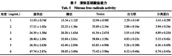 各自用PBs緩沖溶液配備濃度值為:lmg/mL、2mg/mL、3mg/mL、4mg/mL、5mg/mL、6mg/mL的大黑豆分離蛋白水溶液、自化學(xué)交聯(lián)大黑豆蛋白質(zhì)水溶液、寒濕法糖基化大黑豆蛋白質(zhì)水溶液、酶法糖基化大黑豆蛋水溶液及其對(duì)比物Trolox水溶液;以清除率為評(píng)價(jià)方法,對(duì)五種試品溶消除亞硝酸鈉工作能力開展較為,結(jié)果見表5。