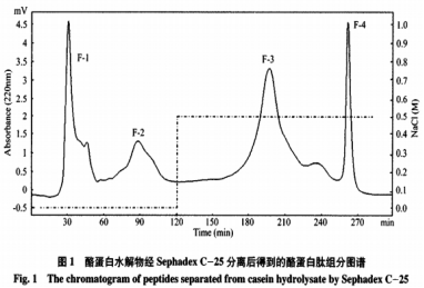 opo結(jié)構(gòu)脂水解反應物經(jīng)SephadexC25疑膠柱分離出來后的譜圖如圖所示1所顯示。由圖1得知,共分離出來獲得4組opo結(jié)構(gòu)脂肽成分,F(xiàn)1和F2成分是由流動性相20mM,pH4.0的冰醋酸緩沖溶液過柱得到;F3和F4成分是由流動性相20mM,pH4.0的冰醋酸緩沖溶液和0.5MNaCl一同過柱得到。本實驗操作中分離出來opo結(jié)構(gòu)脂肽選用的陰離子互換柱層析,以SPsephadexC-25做為固定不動相,在其中以帶負電的磺酸基(一SO3H)為關(guān)鍵作用團,根據(jù)靜電感應相互影響對化學物質(zhì)實現(xiàn)分離出來。因而,F(xiàn)1和F2成分最開始被過柱出來,含有較多的負電;F3和F4成分則含有較多正電。因為F3和F4成分的過柱液中帶有NaCI,這兩成分必須歷經(jīng)除鹽解決。搜集充足量的肽成分后,調(diào)整pH為7.0,低溫干燥后在一80℃標準下儲放預留。