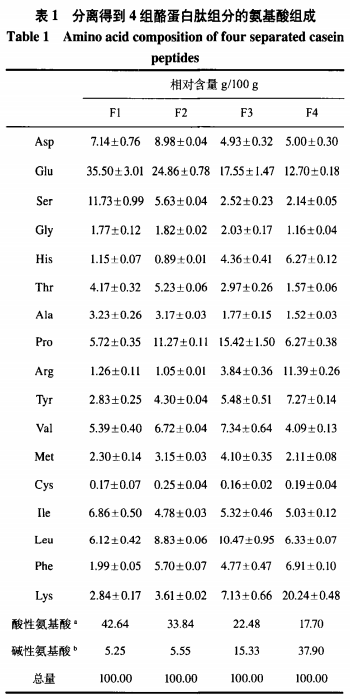 小分子活性肽的通電特性在宏觀經(jīng)濟上體現(xiàn)了其碳水化合物組合而成的差別。含有負電的成分帶有相比較多的酸性氨基酸,而含有正電的成分帶有相比較多的堿性氨基酸。選用柱前衍化法對分離出來獲得的opo結(jié)構(gòu)脂肽成分的碳水化合物構(gòu)成開展剖析,結(jié)果如表1所顯示。F1-F3成分中酸性氨基酸成分高過偏堿氨墓酸成分。在其中,F(xiàn)1成分中酸性氨基酸(Asp和Glu)成分占總碳水化合物成分的42.64%;F2成分中酸性氨基酸成分占33.84%;F3成分中堿性氨基酸(His、Arg、Lys)成分顯著高過F1和F2成分,做到15.33%。因而,F(xiàn)1、F2和F3可看作帶負電的成分,掌電勢差較低。F4成分中偏堿碳水化合物成分高過酸性氨基酸成分,堿性氨基酸占碳水化合物數(shù)量的37.90%。F4為帶正電成分,亭電勢差較高。除此之外,有科學研究報導,具備融合二價金屬離子工作能力的氨基酸殘基包含Asp、Glu、His、Ser、Cys、Asn和Gin,這種氨基酸殘基在4組opo結(jié)構(gòu)脂肽成分中的成分各自為55.5%、40.4%、29.4%和26.1%。再融合碳水化合物構(gòu)成剖析得知,分離出來獲得的4組opo結(jié)構(gòu)脂肽成分都能夠鰲合鋅離子,而且鰲合鋅的實力從F1成分到F4成分慢慢變?nèi)酢?/p>