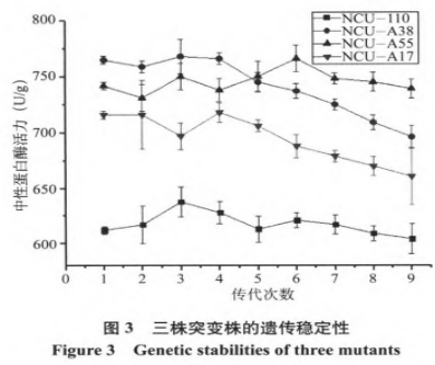 由圖3得知,伴隨著傳代頻次的增加,基因突變株NCU—A38、NCU—A17發(fā)生了一定程度上的衰落,產(chǎn)酶工作能力有些降低,集中化發(fā)生在傳代6次之后,最后在第九代各自降低至696.4 U/g、661.2U/g,降低力度分別為8.3%、7.7%;而基因突變株NCU—A55和初始菌種歷經(jīng)9代傳代培養(yǎng)后,中性化胰蛋白酶活各自為739.0U/g ,604.0U/g,僅降低0.4%、0.6%,降低力度較小,基因遺傳可靠性優(yōu)良。綜合性考慮到基因突變株產(chǎn)中性蛋白酶魅力及基因遺傳可靠性,選擇基因突變株NCU—A55開(kāi)展后面科學(xué)研究。