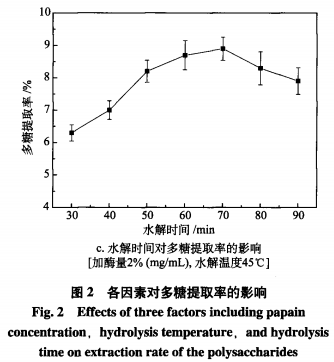 加酶量、水解反應(yīng)溫度、水解反應(yīng)時(shí)間三個(gè)要素對(duì)末水壇海菜含糖量獲取率的危害見圖2。
