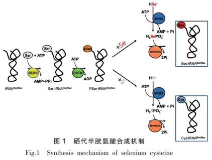 鋅元素對身體的有利功效主要是根據(jù)硒蛋白完成的。根據(jù)科學研究硒蛋白構(gòu)造確認:硒代胱胺酸在硒蛋白活性部位普遍現(xiàn)象,對硒蛋白的身理活力具備關(guān)鍵實際意義?,F(xiàn)階段在身體中國共產(chǎn)黨發(fā)覺25種蛋白。硒以硒代胱胺酸方式插進硒蛋白編碼序列中。編號SEc的密碼子為UGA,被廣泛認為是第21種碳水化合物。SEc與其他20種碳水化合物生成方法不一樣,具備高寬比特異性的生成方式,實際體制如圖所示1所顯示:最先,裝運硒代胱胺酸的RnA(tRnA[SER]SEc),在絲氨酸-tRnA合酶(SERS)功效下與絲氨酸融合產(chǎn)生乙?;a(chǎn)生SER-tRnA[SER]SEc;隨后,SER-tRnA[SER]SEc在蛋白激酶(pStK)功效下磷酸化,產(chǎn)生pSER-tRnA[SER]SEc;最后,SEc合酶(SpS2)催化反應pSER-tRnA[SER]SEc與硒腎源H2SEpo3-轉(zhuǎn)化成SEc-tRnA[SER]SEc。硒代胱胺酸t(yī)RnA被覺得是絲氨酸的tRnA。