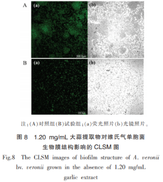 氣單胞菌屬的涂膜工作能力是受人群磁感應(yīng)管控的。根據(jù)結(jié)晶紫染色法和cLSm技術(shù)指標(biāo)分析蒜頭提取液對維氏氣單胞菌生物膜系統(tǒng)產(chǎn)生工作能力的危害,結(jié)果見圖7、圖8。剖析得知,大蒜提取物對維氏氣單胞菌的生物膜系統(tǒng)產(chǎn)生有顯著性的抑制效果(P<0.05),且大蒜提取物的濃度值與其說抑止活力呈量效關(guān)聯(lián)。與實驗組對比,在1.20mg/mL大蒜提取物的效果下,尿培養(yǎng)24h后建立的生物膜系統(tǒng)量明顯減少36.7%(P<0.05)。根據(jù)剖析維氏氣單胞菌涂膜構(gòu)造的轉(zhuǎn)變,發(fā)覺經(jīng)1.20mg/mL大蒜提取物解決,該病菌產(chǎn)生的生物膜系統(tǒng)體細(xì)胞相對密度顯著減少,構(gòu)造比較松散。LI等發(fā)覺大蒜精油中的人群磁感應(yīng)活性物質(zhì)能高效抑止銅綠假單胞菌的生物膜系統(tǒng)造成及膜中的病菌總數(shù)。BjarnSholT等研究發(fā)現(xiàn),大蒜提取物解決后銅綠假單胞菌產(chǎn)生的細(xì)胞外基質(zhì)對抗菌素的耐受力大幅度降低。運用人群磁感應(yīng)緩聚劑影響食源性腐壞菌或病菌的生物膜系統(tǒng)產(chǎn)生,可減少微生物菌種環(huán)境污染,提升食品工業(yè)的安全系數(shù)。