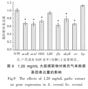 運用RT-PcR技術(shù)指標(biāo)分析大蒜提取物對維氏氣單胞菌基因的表達(dá)量的危害,結(jié)果見圖9。與實驗組對比,經(jīng)1.20mg/mL的蒜提取液解決,AcuR、AcuI、ODC、flA、AhyB、ser的基因的表達(dá)量均明顯下降(P<0.05),LDC和liP的基因的表達(dá)量沒有顯著性差異轉(zhuǎn)變(P>0.05)。在其中,AcuR和AcuI基因表達(dá)量各自降低32.8%和34.6%,表明維氏氣單胞菌的AHLS人群磁感應(yīng)表述遭受抑止。ODC基因的表達(dá)量的下降表明該菌產(chǎn)腐胺的實力遭受一定程度上的抑止。AhyR和ser基因的表達(dá)量的下降,表明維氏氣單胞菌胞外胰蛋白酶活力得到抑止。RaSmuSSen等研究發(fā)現(xiàn),經(jīng)20mg/mL大蒜提取物解決,銅綠假單胞菌的延展性胰蛋白酶基因表達(dá)量下降10倍。除此之外,維氏氣單胞菌經(jīng)1.20mg/mL大蒜提取物解決,微絨毛遺傳基因flA的表述量下降37.2%。mySzka等研究發(fā)現(xiàn),根據(jù)影響病菌人群磁感應(yīng)并抑止微絨毛基因的表達(dá),能明顯減少病菌在不銹鋼板表層的匯聚水平和涂膜工作能力。