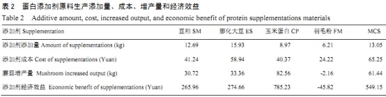 依據(jù)不一樣蛋白質(zhì)添加物化學(xué)成分,最后確認(rèn)各添加物的增加量見(jiàn)表2。本科學(xué)研究統(tǒng)計(jì)分析了2018年山東地區(qū)添加物原材料和MCSubstradd/kg商業(yè)服務(wù)添加物價(jià)錢(qián),各自為SM3250元/t、ES370零元/t、CP4五百元/t、FM390零元/t、MCSubstradd商業(yè)服務(wù)添加物MCS5000元/t。增產(chǎn)量以CTL組生產(chǎn)量為基本,每m2應(yīng)用83.33kg培養(yǎng)料。MCS加上成本費(fèi)最大,做到65.25元/t,羽毛粉加上成本費(fèi)最少,為24.2兩元/t。每t培養(yǎng)料中添加物高產(chǎn)最大為CP組(82.56kg),MCS組其次(61.44kg),F(xiàn)M組最少,且為持續(xù)下滑,限產(chǎn)2.16kg。依據(jù)現(xiàn)階段雙孢蘑菇在出廠均價(jià)(十元/kg),添加物的經(jīng)濟(jì)收益為菌類高產(chǎn)增收扣減添加物成本費(fèi)后的具體盈利。每t培養(yǎng)料中添加物造成經(jīng)濟(jì)收益最大為CP組(785.23元);MCS組其次,為549.15元;FM組最少,虧本45.8兩元。