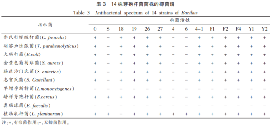 從杜蠣中基本挑選出的對普遍食源性病原菌有抗菌活力的菌種有14株(取名為O、S、18、19、26、27、4、6、4-1、F1、F2、F4、Y1、Y2)。這種病菌在板材上具備典型性的枯草芽孢菌形狀,即菌體平扁、不光滑不全透明、邊沿不齊整、微淡黃色,且革蘭氏染色后結果均呈陽性。這14株菌對普遍病原菌的抗菌譜見表3。在其中O、18、19、26、27、4-1、F1、F2、F4、Y1、Y2等菌種具備廣譜性抗菌性,不但對橙黃色鏈球菌(S.aureus)、蠟樣枯草芽孢菌(Bacilluscereus)、乳酸菌(L.plantanrum)等革蘭氏陽性菌具備不錯的抗菌實際效果,并且對弗氏檸檬酸鈉鏈球菌(C.freundii)、副血溶弧菌(V.parahemolyticus)、大腸埃希菌(E.coli)、腸胃沙門菌(S.enterica)、福氏志賀氏菌(Shigellaflexneri)等革蘭氏陽性菌陰性菌也有著不錯的抑制效果。此外,由表3還能夠看得出,菌種18、19、26、27具備類似的抗菌譜,菌種F1、F2、F4、Y1、Y2等抗菌工作能力也十分相似。