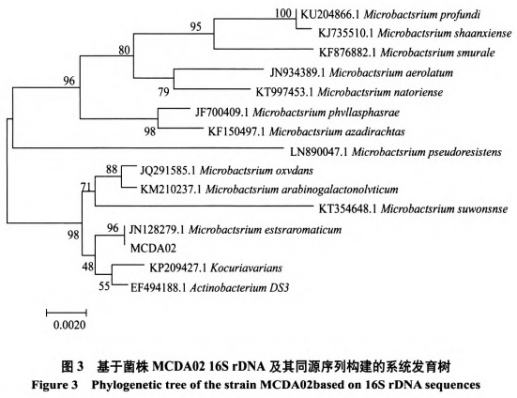 2、菌種MCDA02的評(píng)定菌種MCDA02為革蘭氏陽(yáng)性菌呈陰性短鏈球菌(圖2b),無芽胞。該菌種在LB固態(tài)塑造上塑造48h后:淡黃色,不全透明,表層光潔潮濕,環(huán)形,邊沿整齊,核心稍凸起,易挑菌(圖2a)。該菌種果膠酶、吲哚實(shí)驗(yàn)、氯化氫造成、VP實(shí)驗(yàn)、磷酸鹽復(fù)原實(shí)驗(yàn)、尿素溶液酶、檸檬酸鈉鹽均呈呈陰性,抗霉素、觸碰酶實(shí)驗(yàn)均為呈陽(yáng)性(表1)。菌種MCDA0216SrDNA序列遞交GenBank(登錄名:MH454348),BLAST核對(duì)后發(fā)覺菌種MCDA02與Microbacteriumesteraromaticum的開放閱讀框最大。運(yùn)用MEGA9.0手機(jī)軟件根據(jù)臨接法搭建系統(tǒng)發(fā)育樹(圖3),菌種MCDA02與Microbacteriumesteraromaticum親緣關(guān)系近期,將菌種MCDA02評(píng)定為Microbacteriumesteraromaticum。現(xiàn)階段還沒見酯香微鏈球菌產(chǎn)幾丁質(zhì)脫乙酰酶的報(bào)導(dǎo)。