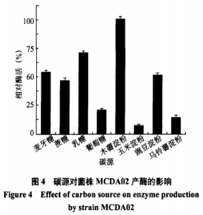 氮源對(duì)菌種MCDA02發(fā)醇產(chǎn)酶的干擾如圖4,選定的8種不一樣的氮源中,木薯淀粉為氮源時(shí)該菌種產(chǎn)酶最大,次之為乳清蛋白,其相對(duì)性酶活也做到了70%之上,玉米粉相對(duì)性酶活最少僅有10%。因而最后采用木薯淀粉做為發(fā)醇培養(yǎng)液的氮源。