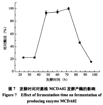 發(fā)酵時(shí)間對(duì)菌種MCDA02生長(zhǎng)發(fā)育的危害如圖所示7,發(fā)酵時(shí)間在36h~48h時(shí),產(chǎn)酶量明顯提升。發(fā)酵時(shí)間處在48h~72h中間時(shí),產(chǎn)酶量增速緩解。發(fā)酵時(shí)間做到72h時(shí)產(chǎn)酶量做到最高處,發(fā)醇72h后菌種MCDA02產(chǎn)酶量逐漸降低。