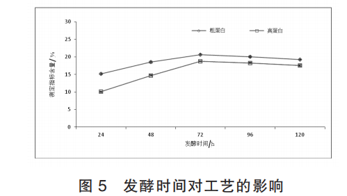發(fā)酵溫度是危害微生物菌種生存和成長的首要因 素之一,溫度上升,微生物菌種生長繁育速度加速;溫度過高,蛋白基本轉(zhuǎn)性而抑止酶促反應(yīng),減少微生物菌種生長繁育速度,因而,適合的氣溫可以推動(dòng)微生 物的繁育生長發(fā)育。 實(shí)驗(yàn)結(jié)果顯示,發(fā) 酵溫度 32 ℃時(shí)粗脂肪與真蛋白質(zhì)成分最大,無機(jī)物氮轉(zhuǎn)轉(zhuǎn)化成有機(jī)化學(xué)氮的轉(zhuǎn)換速度最好是 與科學(xué)研究結(jié)論一致。 發(fā)酵時(shí)間是危害精飼料中真 蛋白質(zhì)成分的主要要素,發(fā)酵時(shí)間短,酵母無法靈活運(yùn)用速效性氮源繁育生長發(fā)育, 無機(jī)物氮轉(zhuǎn)換真蛋白質(zhì)速 率過低;發(fā)醇時(shí)間長,生產(chǎn)制造成本上升。 實(shí)驗(yàn)結(jié)果表 明,發(fā)酵時(shí)間超出 72 h 的粗脂肪成分轉(zhuǎn)變差別較小, 可溶性糖成分在發(fā)酵時(shí)間 48 h 后快速降 低,最好發(fā)酵時(shí)間為 72 h。