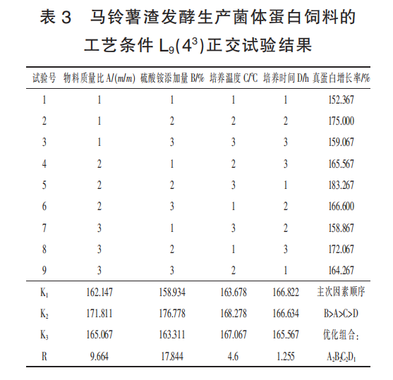 由表 3 得知,4 個(gè)要素對(duì)有機(jī)化學(xué)氮年增長率危害的層次次序?yàn)?B>A>C>D,在其中,硫酸銨加上量對(duì)土豆薯渣發(fā)醇生產(chǎn)制造菌 體蛋白質(zhì)飼料中真蛋白質(zhì)成分提升的危害較為明顯, 次之為薯渣與麥麩的品質(zhì)占比組成與塑造溫度,危害很小的要素為塑造時(shí)間。 最適合固態(tài)發(fā)酵生 產(chǎn)菌體蛋白質(zhì)飼料的加工工藝搭配為 A2B2C2D1。 即薯 渣與麥麩的品質(zhì)例為 85S 15F, 硫酸銨加上量為2%,塑造溫度 32 ℃,塑造時(shí)間 72 h。 根據(jù)正交實(shí)驗(yàn)方差分析結(jié)果顯示(表 4),前三個(gè)要素 A、B、C 對(duì)土豆薯渣發(fā)醇生產(chǎn)制造菌體蛋白質(zhì)飼料真蛋白質(zhì)提高 率的危害均具備明顯差異水準(zhǔn)(P < 0.05),要素D 對(duì)真蛋白質(zhì)年增長率的危害差別不明顯,因而,挑選 短期內(nèi)固態(tài)發(fā)酵省時(shí)省經(jīng)濟(jì)發(fā)展成本費(fèi)且成效顯著。