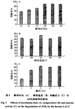 由圖5A能夠看得出,漆酶與AFB1孵育時(shí),當(dāng)孵育時(shí)間在12~24h內(nèi),溶解率慢慢上升,時(shí)間超過24h,溶解率保持穩(wěn)定為90.33%;由圖5B能夠看得出,在25~30℃范疇內(nèi),AFB1溶解率基本上維持不會(huì)改變,在35℃做到為最大值77.45%,當(dāng)環(huán)境溫度在35~40℃范疇內(nèi),溶解率減少,當(dāng)環(huán)境溫度超過40℃時(shí),稍微上升,與大部分細(xì)菌漆酶一樣,LAC3是一種非常耐高溫的酶,可是耐溫性是有關(guān)快門速度的涵數(shù),當(dāng)環(huán)境溫度高過40℃,該酶在這里標(biāo)準(zhǔn)曝露12h后有可能造成 降解較快,活力減少;由圖5℃能夠看得出,在試驗(yàn)標(biāo)準(zhǔn)區(qū)域內(nèi),內(nèi)毒素的溶解率隨漆酶酶魅力的提高而慢慢上升,當(dāng)酶魅力做到3U時(shí),AFB1的溶解率做到最高值74.87%,再次增加酶量,溶解率基本上沒有提高。