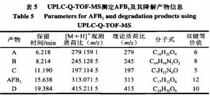 為進一步明確4種溶解物質(zhì)的化學結(jié)構(gòu)式,運用Q-TOF-MS開展剖析。在所有反映系統(tǒng)中,AFB1只含C、H、O3元素表,酶的本質(zhì)為蛋白,運用酶溶解則很有可能引進N原素。運用收集到的各溶解物質(zhì)的質(zhì)譜分析數(shù)據(jù)信息,預測分析各物質(zhì)很有可能的元素組成和化學式,如表5所顯示。