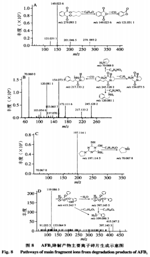 AFB1關(guān)鍵由4個不一樣的溶解功效結(jié)構(gòu)域:1)香豆素內(nèi)酯環(huán)不穩(wěn)定,在外部標準下能脫羰基)能與核苷酸、蛋白等融合的咪唑環(huán)烴基和H2O、H等產(chǎn)生加成反應。3)環(huán)戊烯酮環(huán)根據(jù)加成反應、取代反應危害AFB1的毒副作用。4)苯環(huán)上的-0CH3能夠與-OH、H、-CHO產(chǎn)生取代反應。與此同時,AFB1的一部分溶解物質(zhì)中間還可以互相轉(zhuǎn)換。如圖所示8A所顯示,溶解物質(zhì)A在撞擊中造成[M H] 為m/z279.0932的磷酸激酶正離子,依據(jù)高分辨質(zhì)譜結(jié)果線性擬合的化學結(jié)構(gòu)式為C16H22O4,與此同時造成[M H] 為m/z201.0465、149.0236、121.0311的特點殘片正離子。依據(jù)二級質(zhì)譜分析特點正離子m/z149,并運用Scifinder和Reaxy數(shù)據(jù)庫查詢查找。由溶解物質(zhì)A的特點殘片正離子[M H] 為m/z149.0236推斷的結(jié)構(gòu)特征與Samuel等分析出的Pseudomonasputida溶解AFB1獲得的AFD3物質(zhì)構(gòu)造一致,而且經(jīng)試驗認證該化學物質(zhì)對Hela體細胞的毒副作用遠低于AFB1。如圖所示8B所顯示,溶解物質(zhì)B在撞擊中造成[M H] 為m/z245.1282的磷酸激酶正離子,依據(jù)高分辨質(zhì)譜結(jié)果線性擬合的化學結(jié)構(gòu)式為C14H16N2O2,與此同時造成[M H] 為m/z217.1332、120.0811、154.0735、70.0680的特點殘片正離子。依據(jù)二級質(zhì)譜分析特點正離子m/z271,推斷該化學物質(zhì)構(gòu)造中存有一個羰基,并運用Scifinder和Reaxy數(shù)據(jù)庫查詢查找。如圖所示8C所顯示,溶解物質(zhì)A在撞擊中造成[M H] 為m/z197.1145的磷酸激酶正離子,依據(jù)高分辨質(zhì)譜結(jié)果線性擬合的化學結(jié)構(gòu)式為C7H12N6O1與此同時造成[M H] 為m/z70.0678的特點殘片正離子。依據(jù)二級質(zhì)譜分析特點正離子,推斷該化學物質(zhì)中有吡咯烷構(gòu)造,并運用Scifinder和Reaxy數(shù)據(jù)庫查詢查找。如圖所示8D所顯示,溶解物質(zhì)C在撞擊中造成[M H] 為m/z415.2427的磷酸激酶正離子,依據(jù)高分辨質(zhì)譜結(jié)果線性擬合的化學結(jié)構(gòu)式為C24H30O6,與此同時造成[M H] 為m/z397.1455、109.0863的特點殘片正離子。依據(jù)二級質(zhì)譜分析特點正離子m/z397和m/z109,推斷該化學物質(zhì)構(gòu)造中存有一個甲基和苯甲醇結(jié)構(gòu)單元,并運用Scifinder和Reaxy數(shù)據(jù)庫查詢查找。AFB1經(jīng)漆酶溶解后的各物質(zhì)構(gòu)造見圖9。