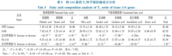 在對飽和脂肪與不飽和脂肪剖析中,影響114遺傳基因會使飽和脂肪成分降低,對不飽和脂肪無明顯危害;過表達114遺傳基因會提升不飽和脂肪油酸的成分,而對飽和脂肪無明顯危害。