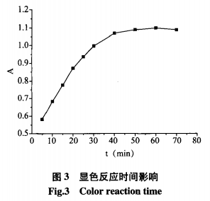 取50ml容量瓶一只,添加CAT樣液(酶促反應(yīng)低于2U/mL)1.00mE、H202栽培基質(zhì)液2.00mL,25℃水浴反映30min后馬上添加1.5mL鹽酸停止反映,加碘酸鉀5mL,60℃水浴加熱40min,制冷,加木薯淀粉3mL,滴定劑,以純凈水作參比液,在光波長600nm處測OD值A(chǔ),與此同時進(jìn)行酶試劑空白OD值A(chǔ)0測量,依據(jù)△A(△A=A0一A)明確過氧化氫酶活力E。其他情況不會改變,只更改反應(yīng)速度,測量5~70min內(nèi)A值(圖3)。30min內(nèi)OD值與時間有線性相關(guān)。不難看出,H2O2空氣氧化KI具備零級反應(yīng)的特性,生成物初始濃度值立即影響了反應(yīng)速率,40min后反映徹底。因此 顯色反應(yīng)時間確認(rèn)為40min。