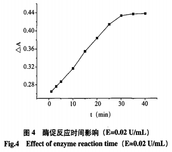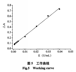 取過氧化氫酶標(biāo)液0.00—20.00mL作檢測液,在最好情況下進(jìn)行△A測量,制作工作中曲線圖(圖5)。過氧化氫酶魅力E(U/mL)在0.002~0.04U/mL范疇內(nèi)與△A呈優(yōu)良的線性相關(guān):△A=0.06843 16.9866E(U/mL),r=0.9970。按實驗方法平行測定空缺10次,相對標(biāo)準(zhǔn)偏差s為0.01,檢出限為0.0018U/mL,最少檢測量做到0.15U。