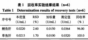利用率操縱在96%~105%范疇內(nèi),表明粗酶液并存化學(xué)物質(zhì)不危害酶促反應(yīng)測量;依據(jù)測量結(jié)果可計算出來魚肝CAT成分各自為550U/g(鯽魚)和537U/g(鯉魚)。