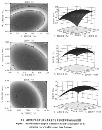 為檢測響應(yīng)面法提升后的加工工藝穩(wěn)定性,考慮到實(shí)驗(yàn)過程的可行性分析,融合單要素試驗(yàn)結(jié)果,將以上獲取加工工藝標(biāo)準(zhǔn)調(diào)整為:酶加上量1.4%,乙醇濃度47.0%,獲取時間38.0min,獲取溫度39.0℃。在這里前提下,開展3組平行面實(shí)驗(yàn),所得的阿爾泰金銀花黃酮類物質(zhì)獲取率平均值為18.02±0.24%,與標(biāo)準(zhǔn)偏差的相對偏差為0.8%,線性回歸方程估計值與真實(shí)值相符合,表明應(yīng)用響應(yīng)面法提升獲得的建模主要參數(shù)精確靠譜,能真正反應(yīng)各要素對阿爾泰金銀花黃酮類物質(zhì)獲取率的危害。
