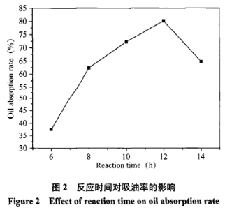 反應(yīng)速度挑選6h、8h、10h、12h、14h,別的主要參數(shù)挑選為:反映溫度50℃、管理體系pH4.8、加酶量11U/g。吸油率如圖2所顯示。
