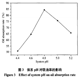 管理體系pH挑選4.4、4.6、4.8、5.0、5.2,別的主要參數(shù)挑選為:反映溫度50℃、反應(yīng)速度10h、加酶量11U/g。吸油率如圖所示3所顯示。