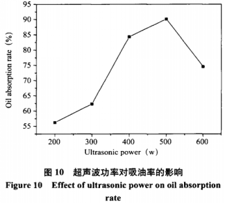 從圖10中還可以看得出,超音波輸出功率在200W~500W中間,伴隨著效率的擴(kuò)大吸油率慢慢擴(kuò)大,在500W時到達(dá)最高值,以后伴隨著超音波輸出功率的提高而減少。這可能是因?yàn)槌暡瘴g抗壓強(qiáng)度是受超音波輸出功率危害的,輸出功率過低比不上輸出功率高的空蝕實(shí)際效果,可是輸出功率過高,很有可能將木薯淀粉顆粒物粉碎,與此同時,超音波還帶來了拌和的功效。